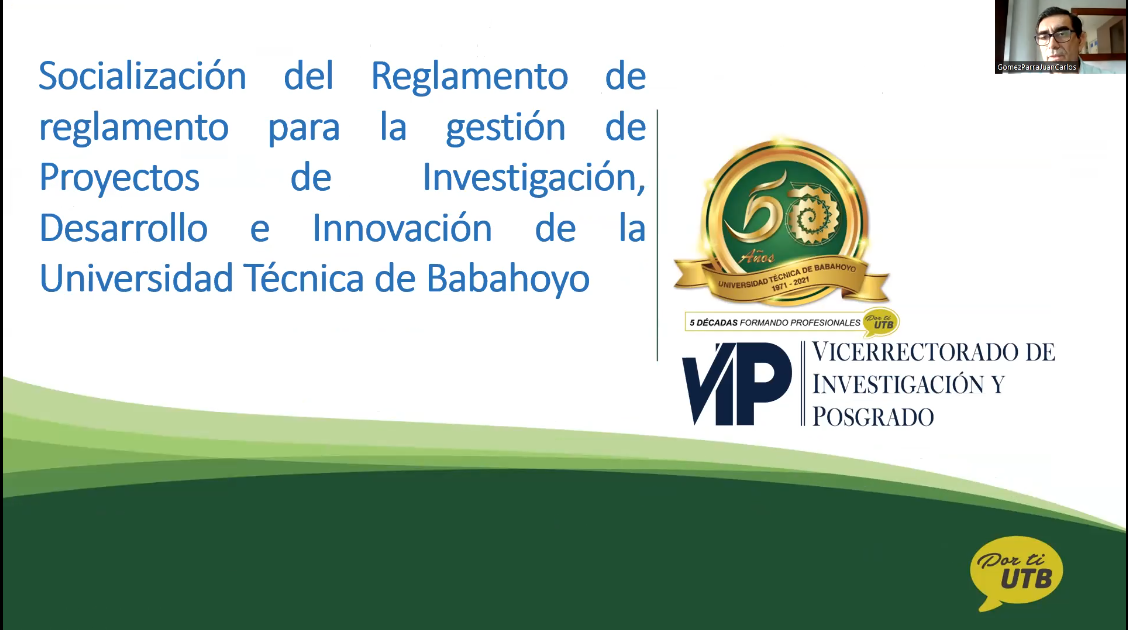 Los días 16 y 17 de febrero de 2022 a través de la plataforma zoom, se socializaron a los docentes de las facultades de la UTB y la extensión de Quevedo; los planes, reglamentos e instructivos relacionados con el Vicerrectorado de Investigación y Posgrado que norman los procesos de sus competencias, con este conocimiento se espera obtener mejores resultados y armonía en todos los ámbitos.