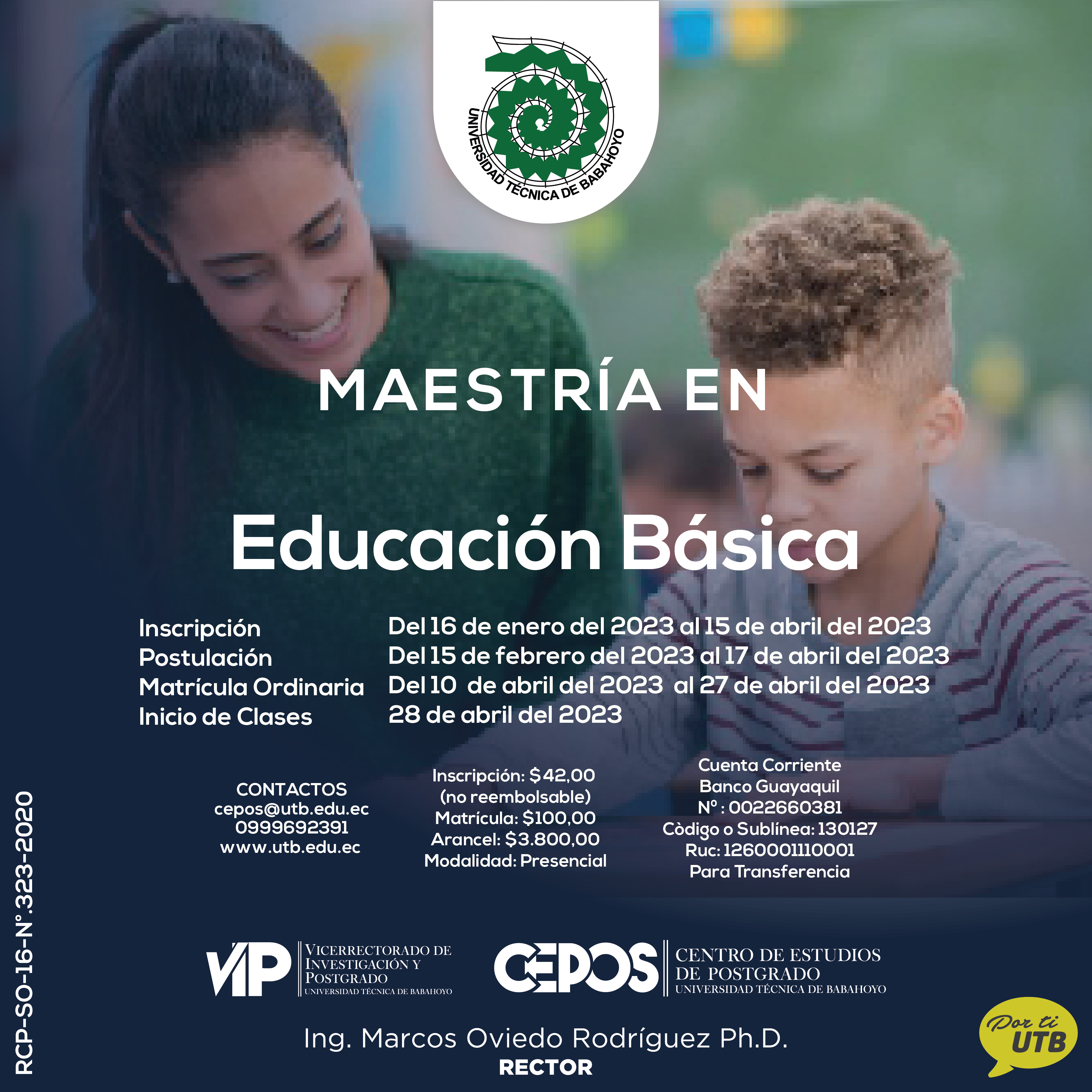 El programa de Maestría en Educación Básica, da la oportunidad de mejorar y actualizar los conocimientos teóricos y prácticos, así como en ciencia y tecnología, para los profesionales de tercer nivel de grado, licenciados en educación con títulos en: Educación Inicial, Educación Básica, Educación en Pedagogía de la actividad Física y deporte, Educación en Pedagogía en la ciencias experimentales y licenciaturas a fines al campo amplio de la educación. En este sentido se recomienda a: Profesionales en el campo amplio de educación. Otros profesionales que realizan la gestión educativa y que acrediten experiencia laboral en la docencia de por lo menos de un año.
